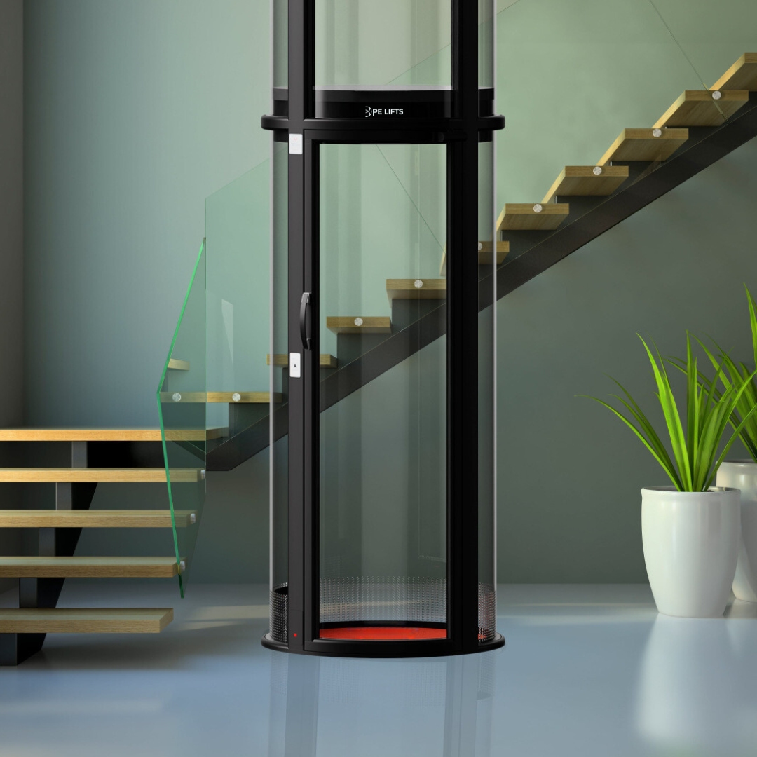Ascenseur pour deux passagers. Diamètre extérieur de 37 pouces (950 mm), capacité de levage de 450 lb (205 kg), vitesse de déplacement de 40 pi/min. Éclairage LED intérieur automatique et ventilateur. Ouvertures de portes alignées, traversantes et à 90°* *Des limitations s’appliquent aux ouvertures de portes à 90°.